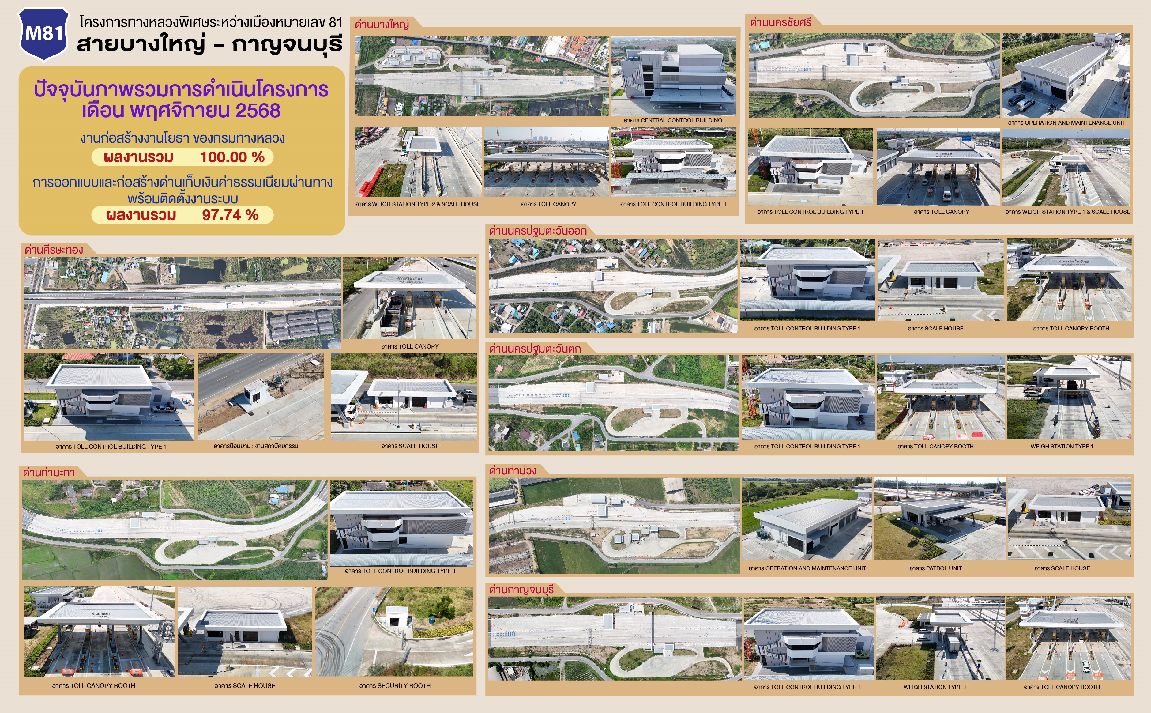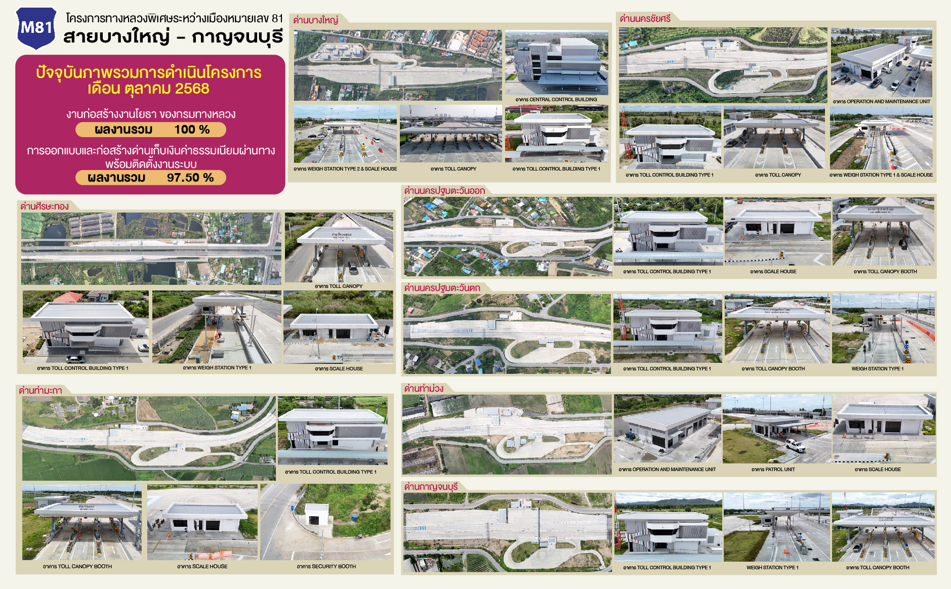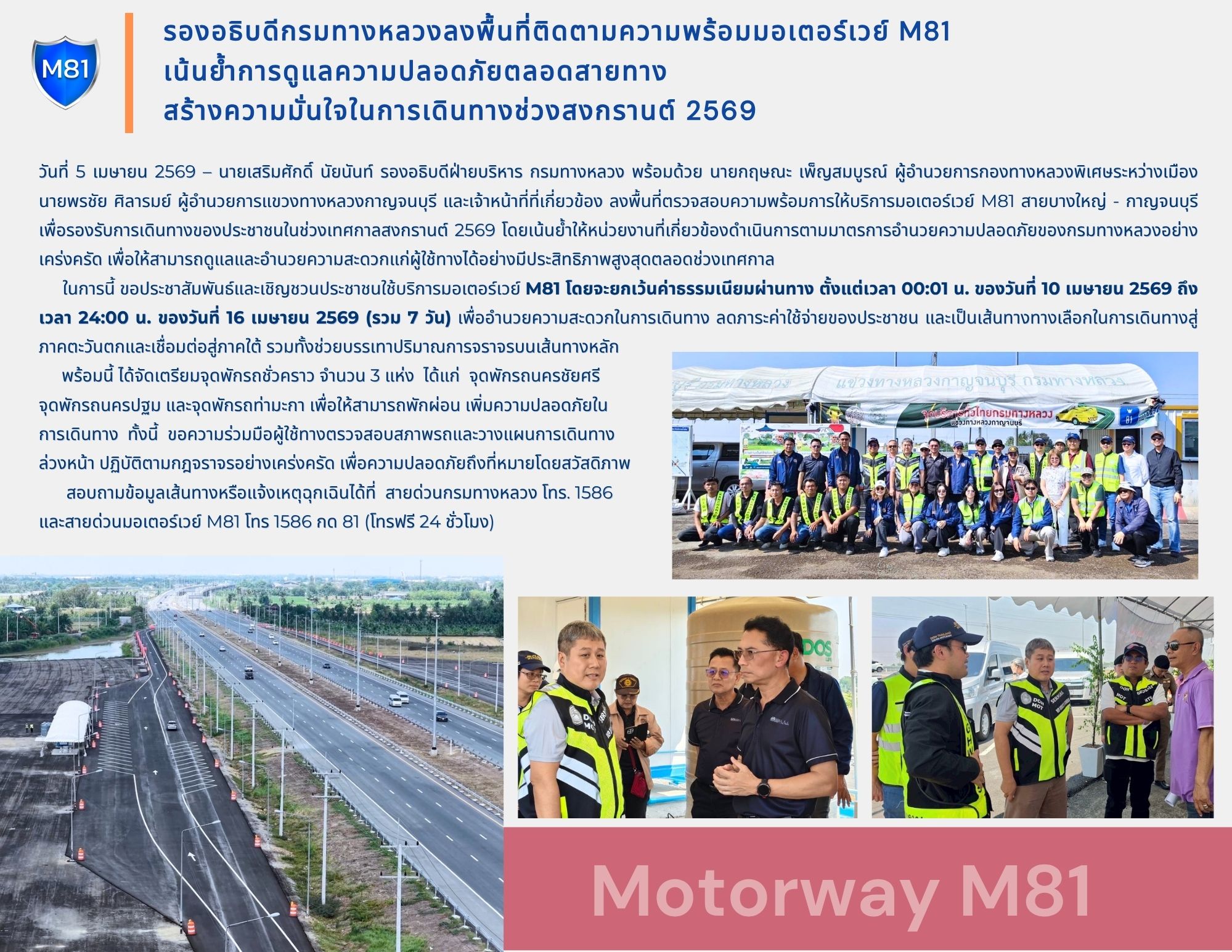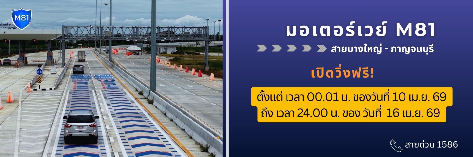 นายสุรพงษ์ ปิยะโชติ รัฐมนตรีช่วยว่าการกระทรวงคมนาคม กล่าวว่า กระทรวงคมนาคม โดยกรมทางหลวง ได้ดำเนินการพัฒนาโครงข่ายทางหลวงพิเศษระหว่างเมือง โดยเฉพาะอย่างยิ่ง ทางหลวงพิเศษระหว่างเมืองหมายเลข 81 สายบางใหญ่- กาญจนบุรี เพื่อเติมเต็มโครงข่ายทางหลวงพิเศษระหว่างเมือง เพิ่มความสะดวก รวดเร็ว และปลอดภัยให้กับประชาชนในการเดินทางและขนส่งสินค้าจากกรุงเทพฯ และปริมณฑล ไปสู่เขตพัฒนาเศรษฐกิจพิเศษจังหวัดกาญจนบุรี และภาคตะวันตกของประเทศ ส่งเสริมการค้า การลงทุน การท่องเที่ยว และเพิ่มขีดความสามารถทางการแข่งขันของไทยบนเวทีโลก ซึ่งเป็นไปตามนโยบายรัฐบาล นายเศรษฐา ทวีสิน นายกรัฐมนตรี และนายสุริยะ จึงรุ่งเรืองกิจ รัฐมนตรีว่าการกระทรวงคมนาคม ในการเดินหน้าขับเคลื่อนนโยบาย “คมนาคมเพื่อความอุดมสุขของประชาชน” โดยวันนี้ทางหลวงพิเศษระหว่างเมืองหมายเลข 81 (สายบางใหญ่ – กาญจนบุรี) พร้อมเปิดให้บริการในช่วงด่านนครปฐมฝั่งตะวันตก ตำบลวังตะกู อำเภอเมือง จังหวัดนครปฐม ตัดกับทางหลวงหมายเลข 321 ที่ กม.6+200 จนถึง ด่านกาญจนบุรี ตำบลหนองขาว อำเภอท่าม่วง จังหวัดกาญจนบุรี ตัดกับทางหลวง หมายเลข 324 ที่ กม.8+400 ระยะเวลา 7 วัน ตลอด 24 ชั่วโมง ตั้งแต่ 27 ธันวาคม 2566 – 3 มกราคม 2567 โดยไม่เก็บค่าธรรมเนียมผ่านทาง เพื่ออำนวยความสะดวกให้แก่ประชาชน โดยเฉพาะอย่างยิ่งพี่น้องประชาชนชาวกาญจนบุรี และจังหวัดใกล้เคียง ที่จะสามารถเดินทางในช่วงปีใหม่ได้อย่างสะดวกรวดเร็วมากยิ่งขึ้น นับเป็นของขวัญปีใหม่ที่กระทรวงคมนาคมมอบให้แด่พี่น้องประชาชน และเป็นการส่งเสริมการท่องเที่ยวจังหวัดกาญจนบุรีและภาคตะวันตกได้เป็นอย่างดี