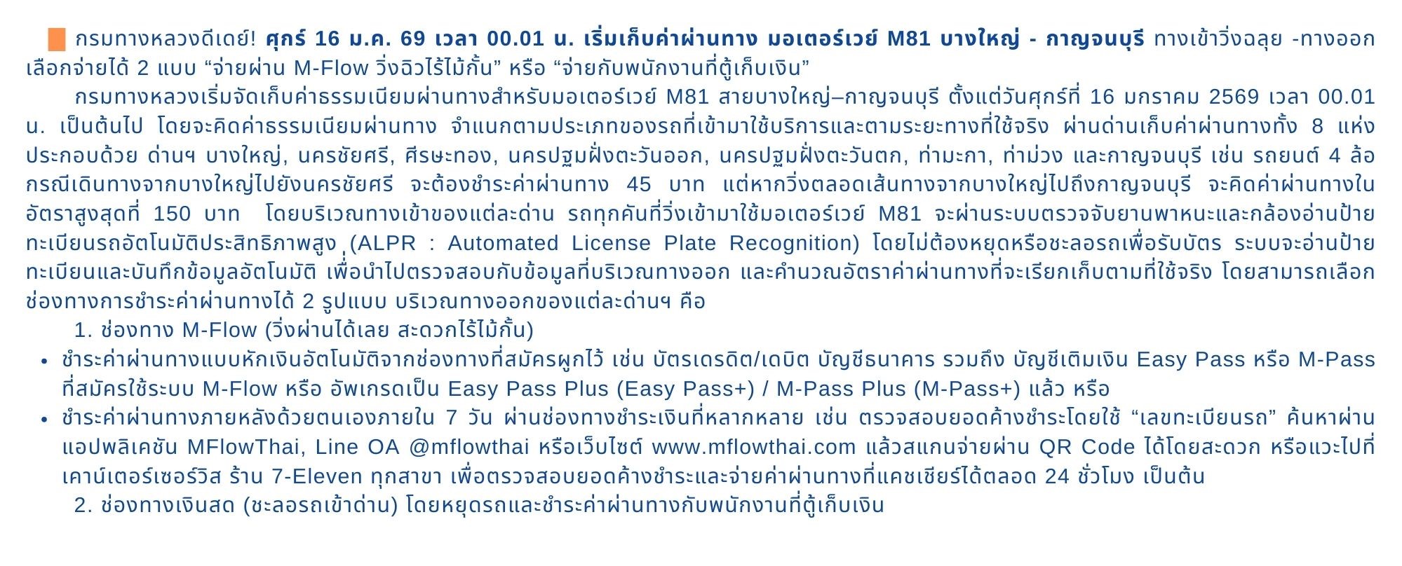 นายสุรพงษ์ ปิยะโชติ รัฐมนตรีช่วยว่าการกระทรวงคมนาคม กล่าวว่า กระทรวงคมนาคม โดยกรมทางหลวง ได้ดำเนินการพัฒนาโครงข่ายทางหลวงพิเศษระหว่างเมือง โดยเฉพาะอย่างยิ่ง ทางหลวงพิเศษระหว่างเมืองหมายเลข 81 สายบางใหญ่- กาญจนบุรี เพื่อเติมเต็มโครงข่ายทางหลวงพิเศษระหว่างเมือง เพิ่มความสะดวก รวดเร็ว และปลอดภัยให้กับประชาชนในการเดินทางและขนส่งสินค้าจากกรุงเทพฯ และปริมณฑล ไปสู่เขตพัฒนาเศรษฐกิจพิเศษจังหวัดกาญจนบุรี และภาคตะวันตกของประเทศ ส่งเสริมการค้า การลงทุน การท่องเที่ยว และเพิ่มขีดความสามารถทางการแข่งขันของไทยบนเวทีโลก ซึ่งเป็นไปตามนโยบายรัฐบาล นายเศรษฐา ทวีสิน นายกรัฐมนตรี และนายสุริยะ จึงรุ่งเรืองกิจ รัฐมนตรีว่าการกระทรวงคมนาคม ในการเดินหน้าขับเคลื่อนนโยบาย “คมนาคมเพื่อความอุดมสุขของประชาชน” โดยวันนี้ทางหลวงพิเศษระหว่างเมืองหมายเลข 81 (สายบางใหญ่ – กาญจนบุรี) พร้อมเปิดให้บริการในช่วงด่านนครปฐมฝั่งตะวันตก ตำบลวังตะกู อำเภอเมือง จังหวัดนครปฐม ตัดกับทางหลวงหมายเลข 321 ที่ กม.6+200 จนถึง ด่านกาญจนบุรี ตำบลหนองขาว อำเภอท่าม่วง จังหวัดกาญจนบุรี ตัดกับทางหลวง หมายเลข 324 ที่ กม.8+400 ระยะเวลา 7 วัน ตลอด 24 ชั่วโมง ตั้งแต่ 27 ธันวาคม 2566 – 3 มกราคม 2567 โดยไม่เก็บค่าธรรมเนียมผ่านทาง เพื่ออำนวยความสะดวกให้แก่ประชาชน โดยเฉพาะอย่างยิ่งพี่น้องประชาชนชาวกาญจนบุรี และจังหวัดใกล้เคียง ที่จะสามารถเดินทางในช่วงปีใหม่ได้อย่างสะดวกรวดเร็วมากยิ่งขึ้น นับเป็นของขวัญปีใหม่ที่กระทรวงคมนาคมมอบให้แด่พี่น้องประชาชน และเป็นการส่งเสริมการท่องเที่ยวจังหวัดกาญจนบุรีและภาคตะวันตกได้เป็นอย่างดี