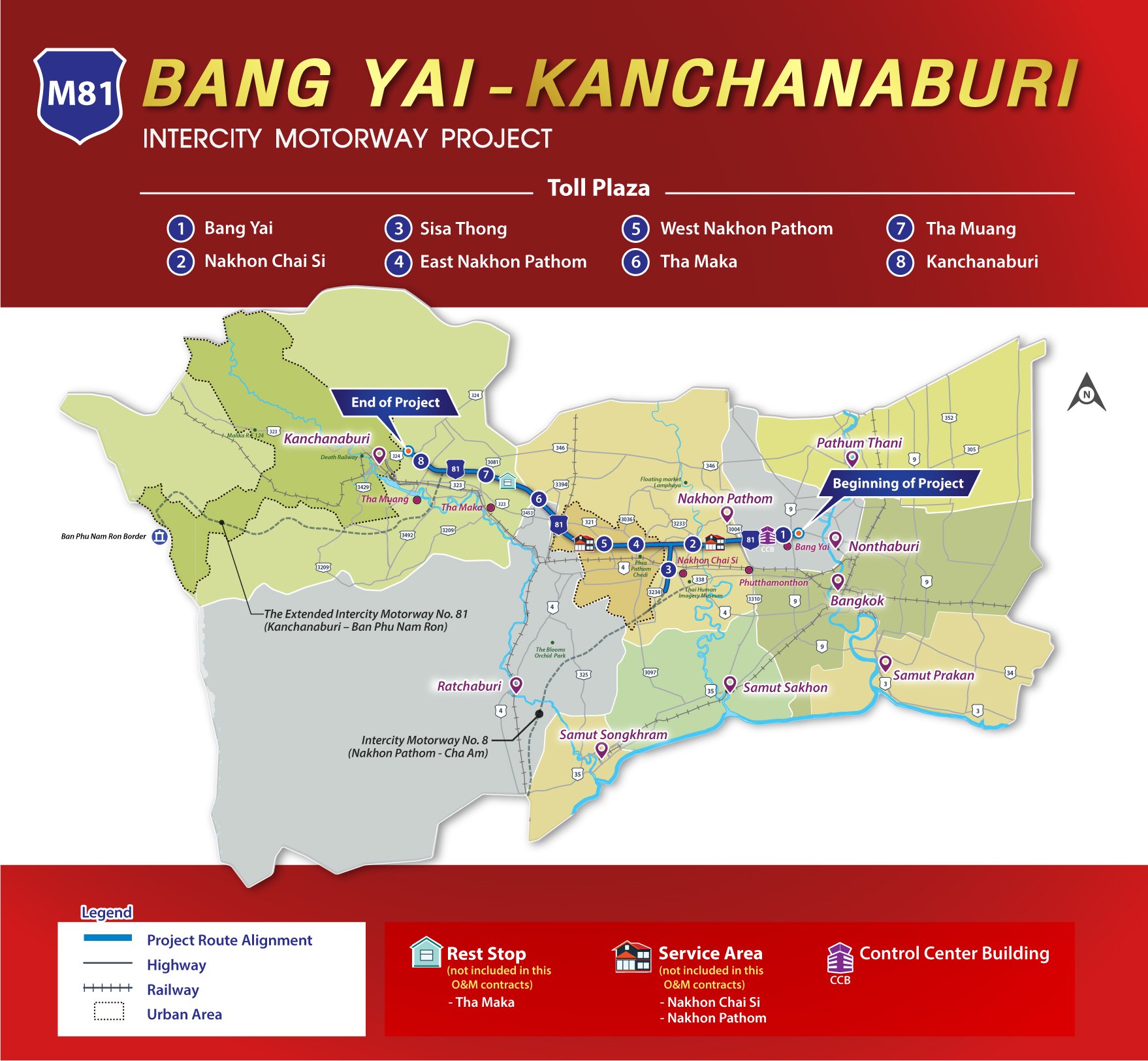 แนวเส้นทางโครงการทางหลวงพิเศษระหว่างเมืองหมายเลข 81 สายบางใหญ่-กาญจนบุรี มีระยะทางรวมประมาณ 96 กิโลเมตร โดยออกแบบให้มีการควบคุมการเข้าออกอย่างสมบูรณ์ มีเริ่มต้นที่จุดตัดทางหลวงพิเศษหมายเลข 9 ด้านตะวันตกกับถนนรัตนาธิเบศร์ บริเวณทางแยกต่างระดับบางใหญ่ อ.บางใหญ่ จ.นนทบุรี และไปบรรจบกับทางหลวงหมายเลข 324 (ถนนกาญจนบุรี-อ.พนมทวน) อ.ท่าม่วง จ.กาญจนบุรี ซึ่งเป็นจุดสิ้นสุดโครงการ รวมถึงมีแนวเส้นทางที่แยกออกจากชุมทางต่างระดับนครชัยศรี ไปเชื่อมต่อกับโครงการทางหลวงพิเศษระหว่างเมือง สายนครปฐม – ชะอำ ซึ่งจะดำเนินการก่อสร้างในอนาคตเป็นระยะทางอีกประมาณ 9 กิโลเมตร